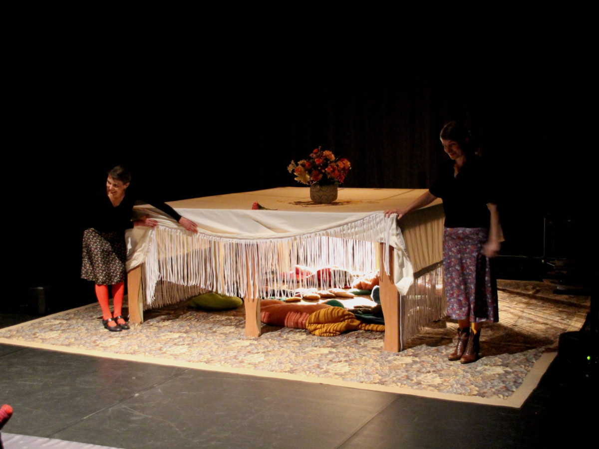 Ouders en kinderen zitten beneden verstopt en zijn getuige van de metamorfose van de tafel: aan de andere kant van de spiegel, daar waar alles verandert, wordt een andere maaltijd opgediend, een ongebruikelijke maaltijd waar het absurde en de poëzie het overnemen en de kwellingen van alledag vrolijk door elkaar schudden.