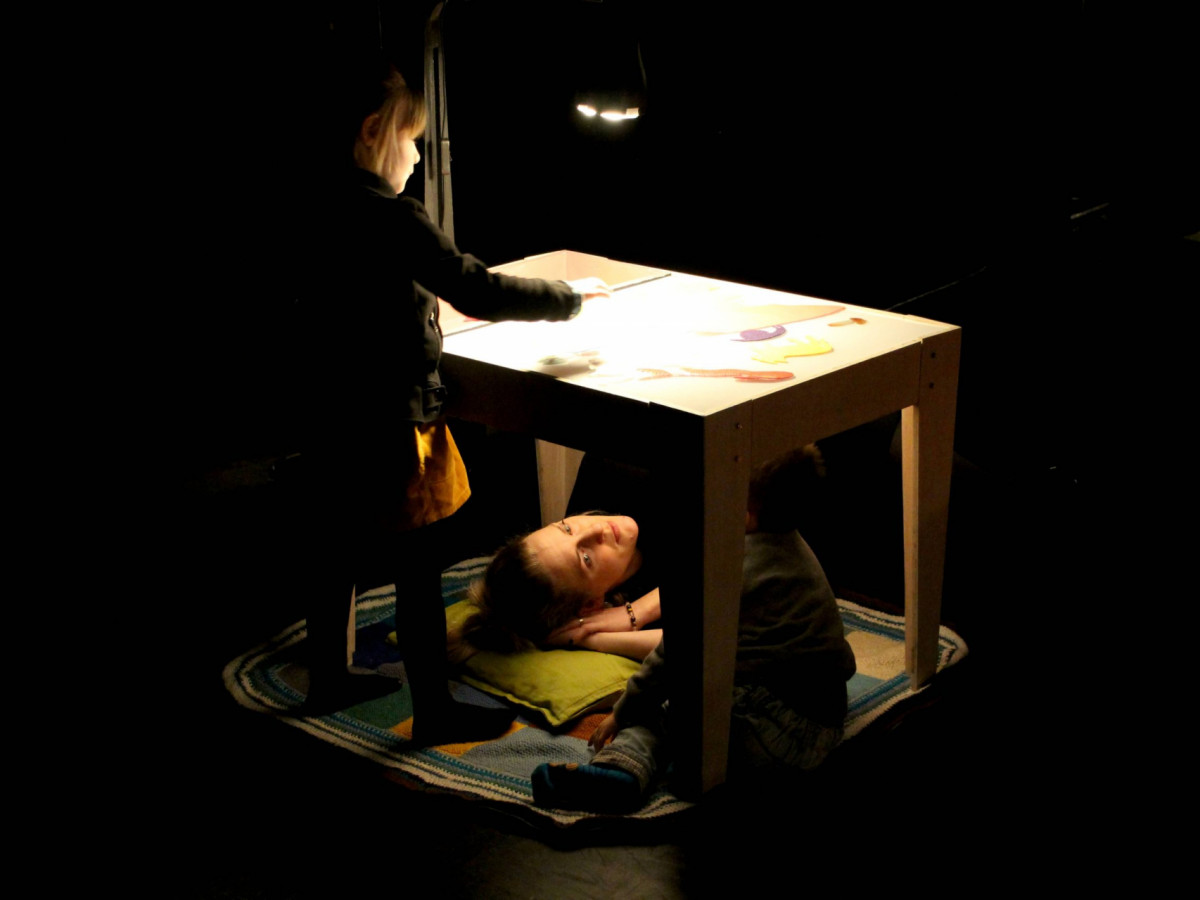 Om beurten kruipen ze onder de kleine tafel en ontdekken van daaruit een schaduwspel dat door het tafelblad wordt gecreëerd.