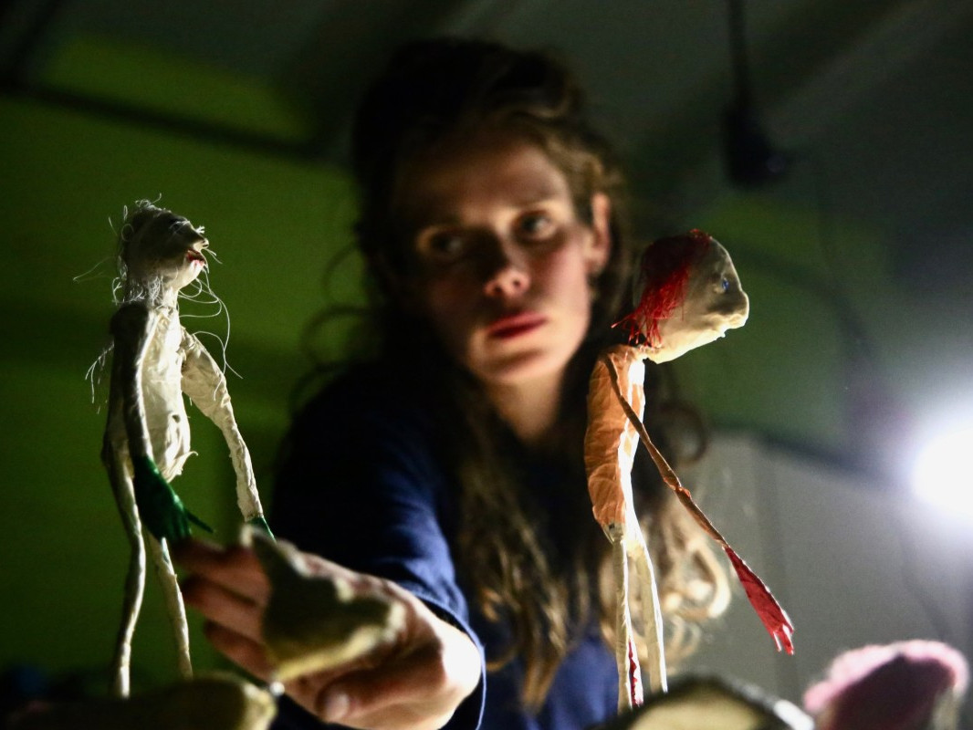 Stefanie maakt beeldende kunst op het toneel – of beter: ze maakt theater van tekeningen en figuren. Haar stijl is grotesk verfijnd.