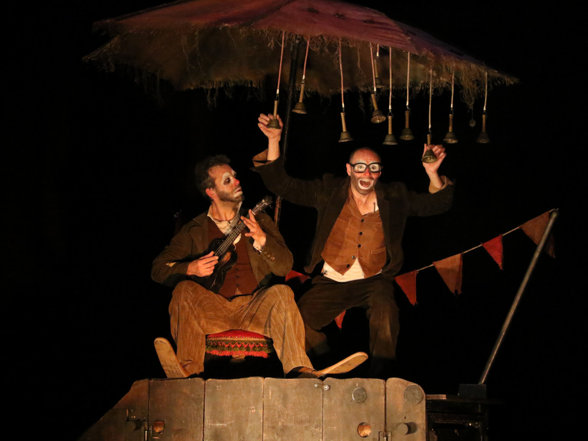 Het karretje waarmee de twee clowns onderweg zijn, zou hen moeten beschermen en onderdak moeten bieden. Het stelt hen echter danig op de proef: het schommelt, het slingert, het maait hen onderuit en schopt hen eruit. De vaste grond lijkt continu onder hun voeten weg te zakken.
